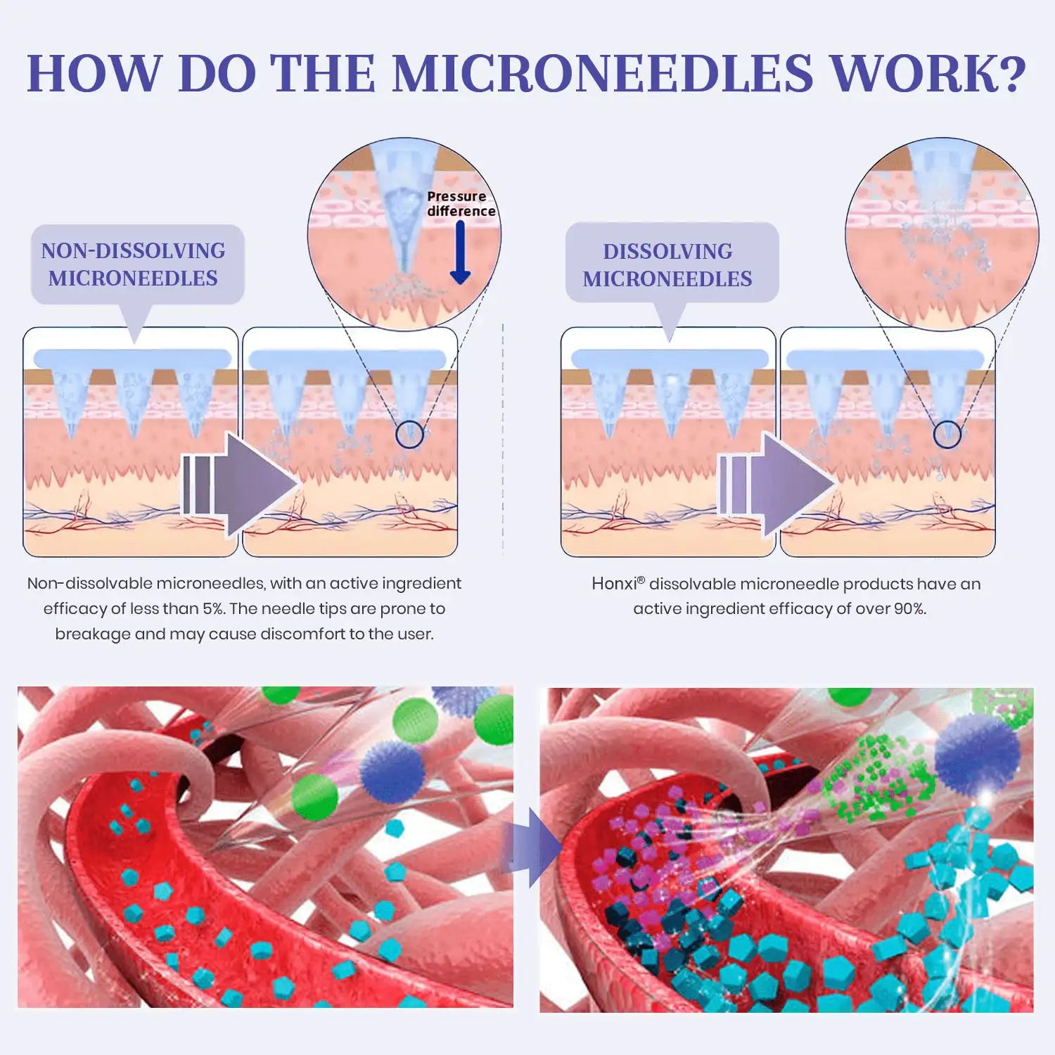 Each needle is 0.27mm long. just 1/7th the thickness of a hair. and is made from dissolvable medication. These micro-needles are precision-engineered using cutting-edge manufacturing techniques to ensure a seamless. pain-free experience while effectively delivering the active ingredients directly into the skin.
