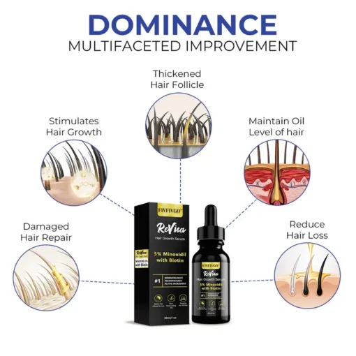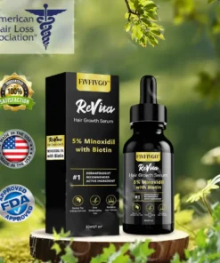 Fivfivgo™ ReVita Hair Growth Serum – your ultimate solution for fostering thicker, more vibrant hair. Formulated with a potent blend of 5% Minoxidil Topical Solution USP and Biotin, this advanced serum works to stimulate the scalp, invigorate hair follicles, and promote natural hair growth.