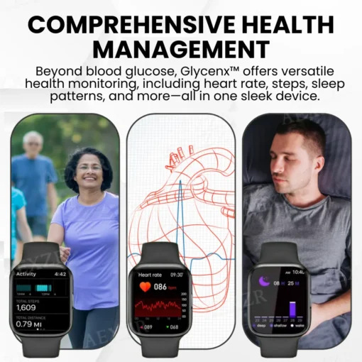 Beyond blood glucose monitoring, Glycenx™ is a multifunctional health management device. It includes features to track heart rate, steps, sleep patterns, and more, making it a comprehensive tool for overall wellness. By integrating multiple health metrics into one sleek device, Glycenx™ helps users maintain a balanced and healthy lifestyle. This versatility eliminates the need for multiple devices, offering an all-in-one solution for health monitoring.