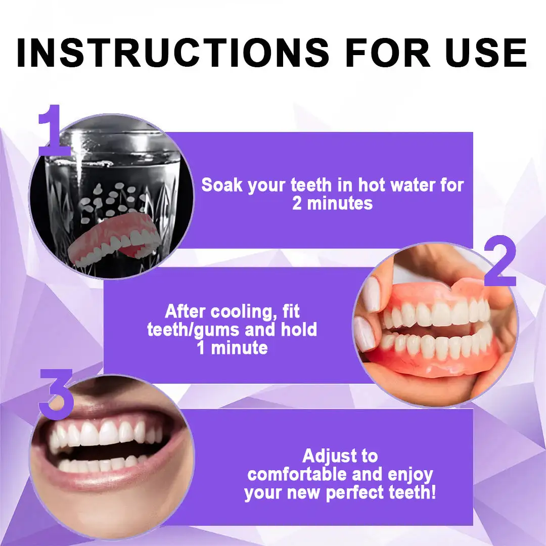 🌟 Easy Fit, Seamless Comfort: Enjoy dentures that adapt perfectly to your mouth from the moment you put them on. Our cutting-edge design ensures a snug and secure fit, providing exceptional comfort that feels like a natural part of your mouth. You can go about your day with confidence, free from discomfort or shifting, allowing you to eat, speak, and smile without any hassle or worry.