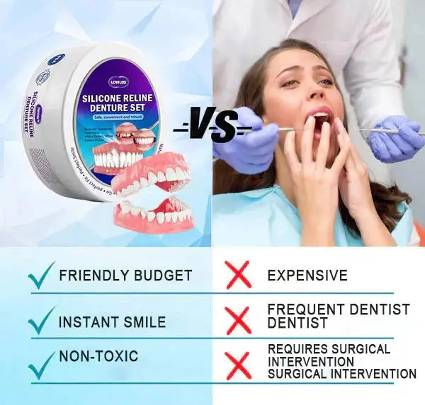 Opt for ultimate denture comfort with LOVILDS™ 𝐒𝐢𝐥𝐢𝐜𝐨𝐧𝐞 𝐑𝐞𝐥𝐢𝐧𝐞 𝐃𝐞𝐧𝐭𝐮𝐫𝐞 𝐒𝐞𝐭. Designed with customizable silicone, it offers immediate relief from soreness and ensures a lasting, secure fit. Safe and non-toxic, this set guarantees denture stability, allowing you to engage confidently in daily activities.