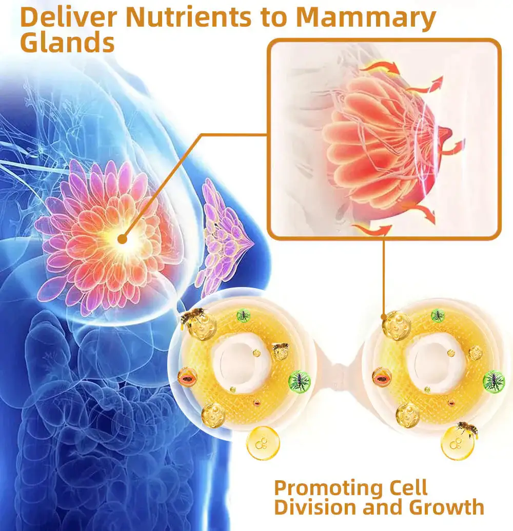 Pure hawthorn extract mimics estrogen, promoting breast tissue growth in absorbent patches. Cypress oil regulates hormones, aiding tissue growth. Nutrient inhalation takes an hour for rapid, safe augmentation.