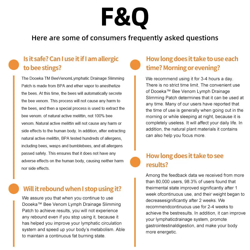 I have combined various botanical ingredients, long known for their benefits to the lymphatic system and body metabolism, to create LOVILDS™ Bee Venom Lymphatic Drainage Slimming Patch. Experimental evidence indicates that this lymphatic drainage slimming patch is the optimal choice for improving the lymphatic system. The blend of these natural botanical ingredients, coupled with the potent properties of bee venom, offers a groundbreaking solution for swiftly addressing metabolic disorders and lymphatic congestion issues.